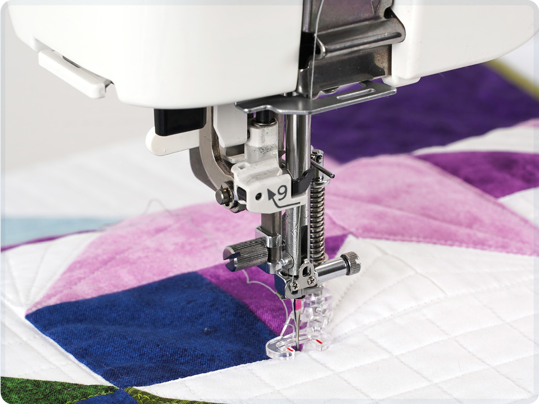 Take advantage of the wide array of precision templates on the market for ruler-guided quilting. Engage the Ruler Work foot to safely follow along the template edge. Achieve beautiful and consistent quilting results previously only available to longarm quilters.