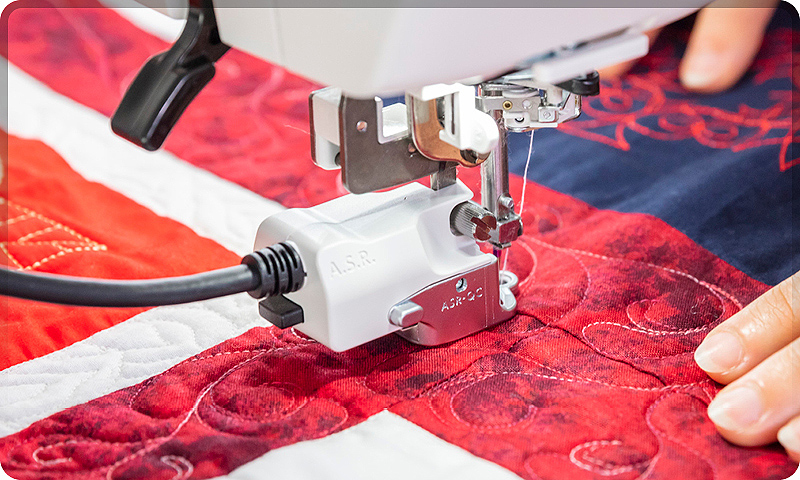 A Janome first! Our new A.S.R.® system comes standard with the CM17 and includes four feet; closed-toe, open-toe, clear view, and the exclusive Ruler Work foot so that all of your free-motion needs are covered. With the added benefit of being able to set the sensitivity of the sensor; you can adjust regulation as your skills build.