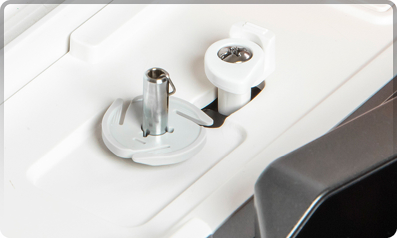 The dual retractable spool pins are widely spaced to accommodate any size spool or cone of thread, even large embroidery or quilting King cones. The spool pins easily fold down when not in use, so they’re well projected when moving or storing the machine. Use the quick release lever to raise spool pins when ready to sew.