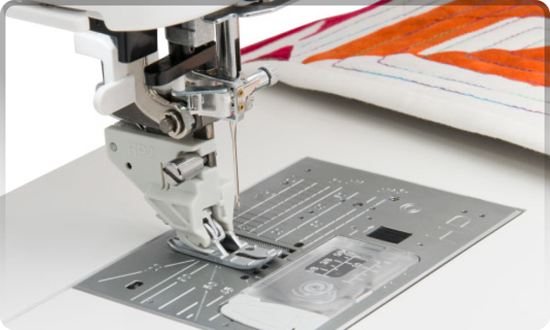 Professional Grade Needleplate, HP and HP2 foot – Utilize these professional narrow gauge industrial-type feet for curves and precise topstitching. Easy to use, they provide excellent control and superior visibility. They are sized perfectly for creating scant 1/4″ seams, achieving accurate stitches and perfect stitches on any type of fabric.