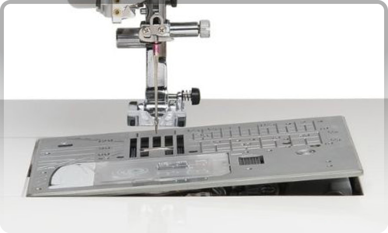 Using the right tools at the right time is essential. A straight stitch needle plate makes all the difference when using lightweight fabrics or piecing quilts. Our computerized one touch plate converter allows you to easily switch and use the perfect plate for your sewing project. Push the on-screen button to release the plate and replace. The CM17 comes with three standard needle plates: zigzag, straight stitch and HP.