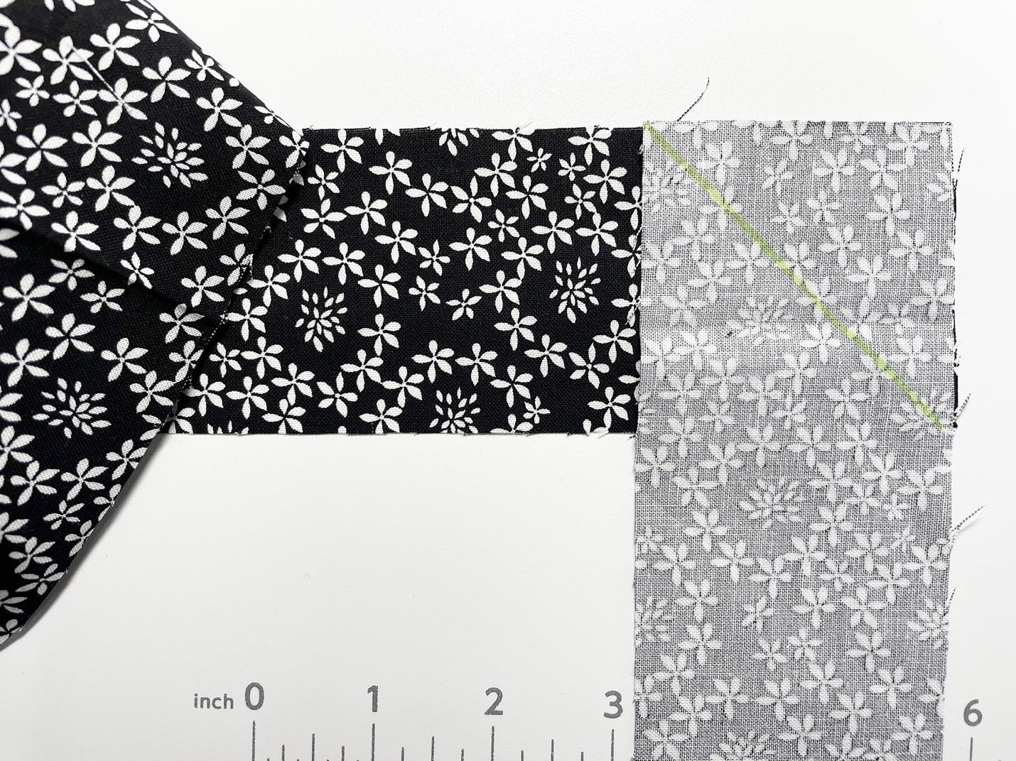 Sew 2.5″binding tails together on the bias. Unfold binding tails. Place fabric on the left-right side up. Then place other binding tail perpendicular right sides together. Draw a diagonal line on the wrong side of the top fabric as shown below. Sewing binding tails on the diagonal (bias) reduces seam bulk.