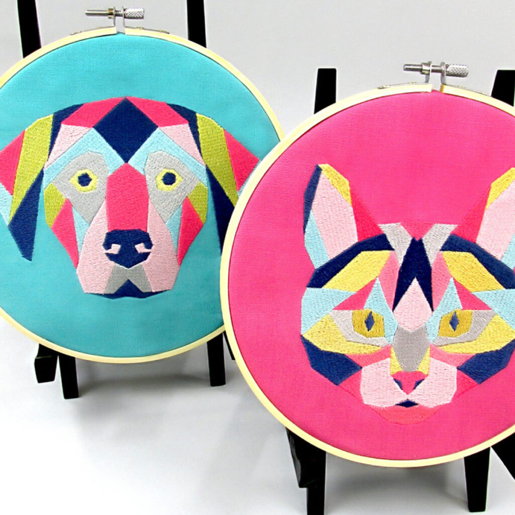 Pets are family. Right now, as we spend more time inside and less time in our traditional social circles, our pets have become even more important companions. Celebrate your love for a special dog or cat with these colourful custom faces. Our samples were framed to hang on a wall or sit on a counter-top, but they can be used to adorn any number of projects. Try one or both on a tote, a pillow set, or even a sweatshirt. The striking Faceted Dog Face and Faceted Cat Face embroidery designs have been created exclusively for Janome Canada by Sew4Home.