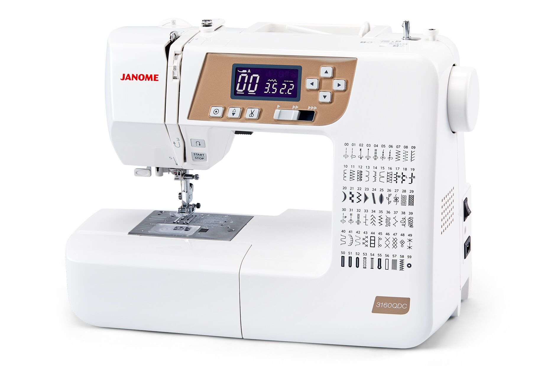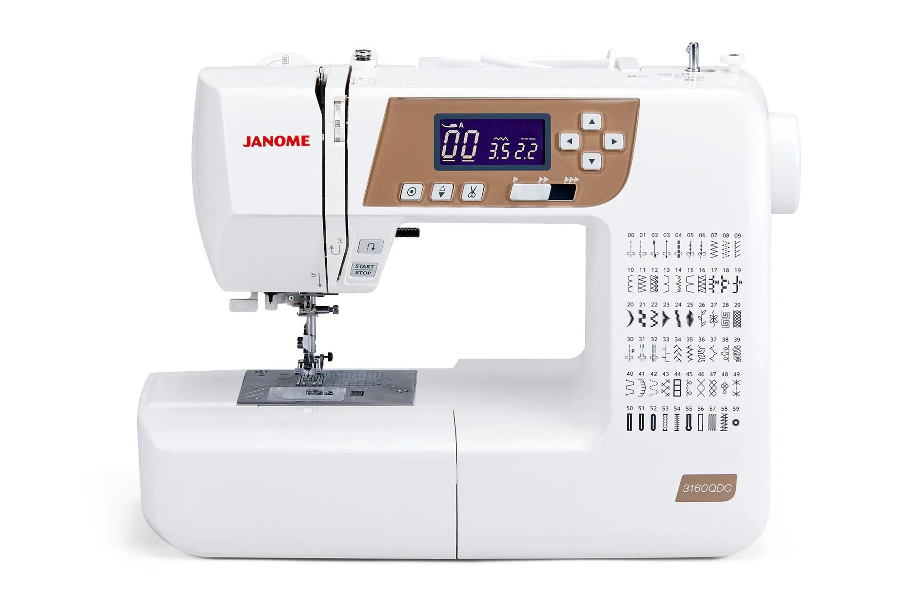 A full-featured machine made with a quilter’s needs in mind- the 3160 QDC-T delivers all the benefits of a top of the line model at an affordable price. You’ll find 60 stitches including 6 one-step buttonholes. Janome’s SFS+ feeding- ensures even stable feeding with any fabric. And the time saving features including memorized needle up/down- one hand needle threader- and lock stitch button make sewing easy. Best of all- this full-size machine weighs only 12 pounds and comes with a hard cover, so its easy to take to classes and guild meetings!