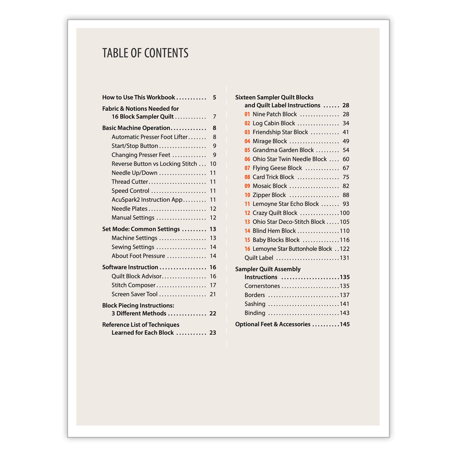 These lessons culminate in the creation of a textured, 16-block sampler quilt (including a label). Completing the quilt is optional, but detailed instructions are provided as a bonus. The workbook includes quilt-as-you-go instructions for the quilt top, as well as guidance for backing and binding. The book also features a reference index that allows users to quickly locate the technique practiced in each block.