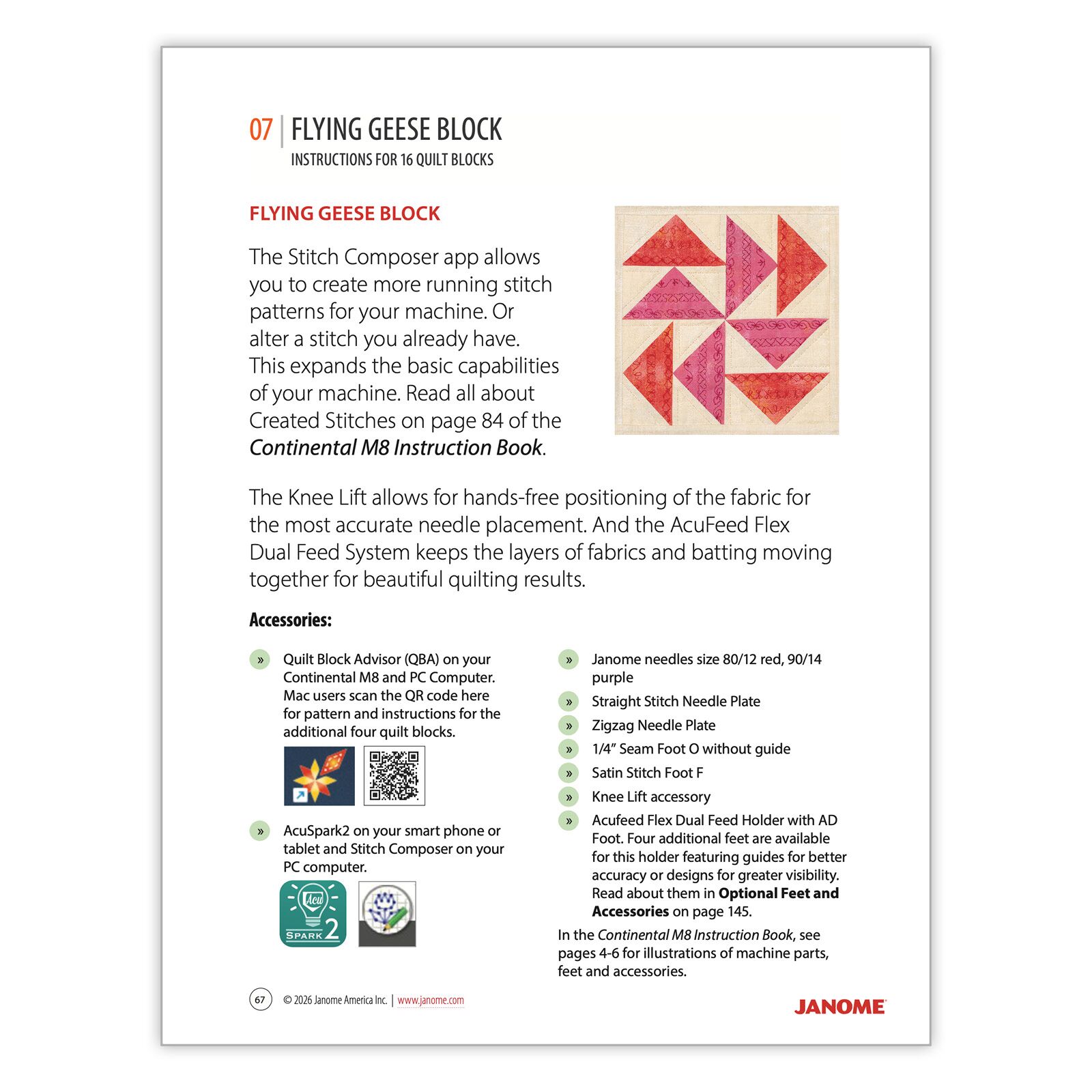 Lessons cover a wide range of techniques, functions and accessories including the AcuSpark2 app, ¼ Seam Guide O foot, Quilt Block Advisor software, quilting with AcuFeed Flex, auto pivot, using the machine’s memory, Satin Stitch Foot F, decorative stitching and stitch combinations, gathering and smocking, stitch-in-the-ditch quilting, the Professional HP foot and plate, cornering and mirror imaging, twin needle stitching, bridge stitch applications, sewing techniques, and more.