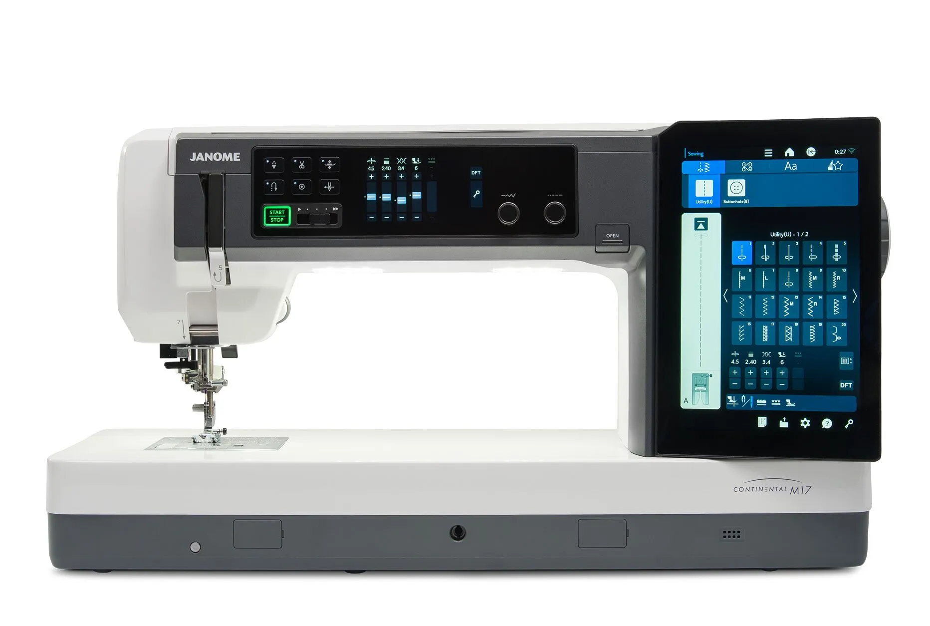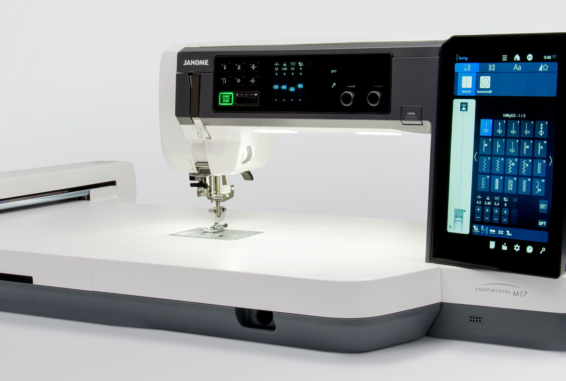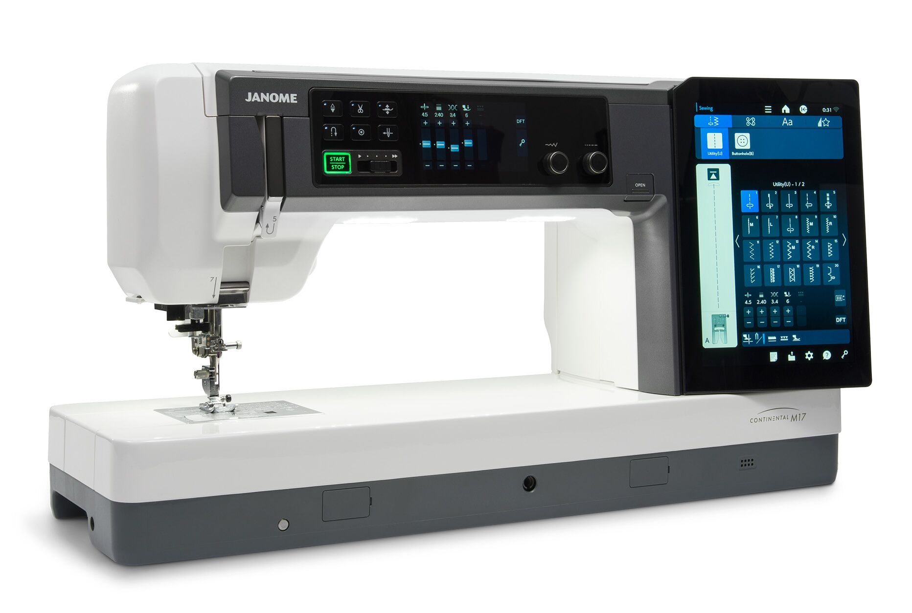There are milestone moments in history that have redefined a sewists creative landscape. The next generation of sewing, quilting and embroidery machine from Janome will revolutionize how you define sewing potential. Meet the Continental M17, a ground breaking combination machine with industry leading features: largest sewing area in the industry and the largest embroidery space, a powerful motor that provides the industry’s fastest stitching speeds, dual colour touch screens, over 1,200 built-in embroidery designs and the largest embroidery hoop in the industry (11 x 18.1” / 280 x 460 mm), 5 wireless apps (AcuAssist on-screen help, Embroidery-Link, AcuSetter, AcuSketch, ScreenSaver), Artistic Digitizer JR, A.S.R.® (Accurate Stitch Regulator) for free-motion and ruler quilting, shadow free sewing area, needle bar thumb wheel for precise control, a LED embroidery spotlight positioning marker and so much more.