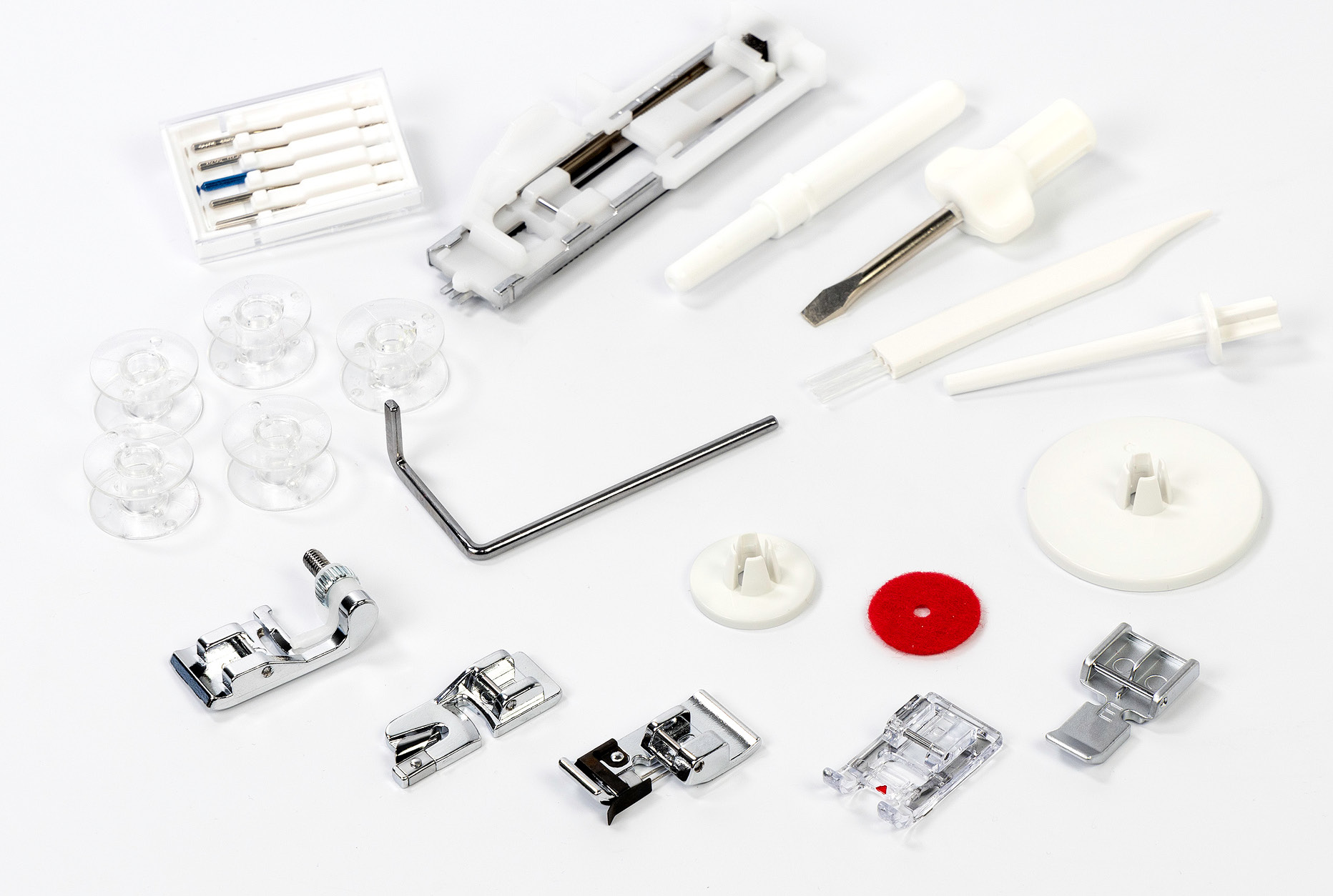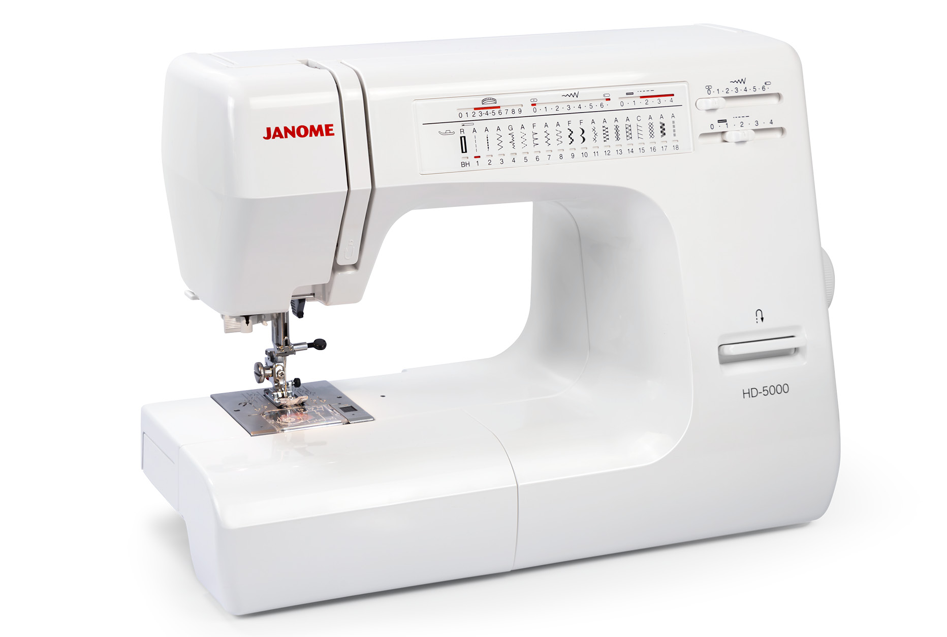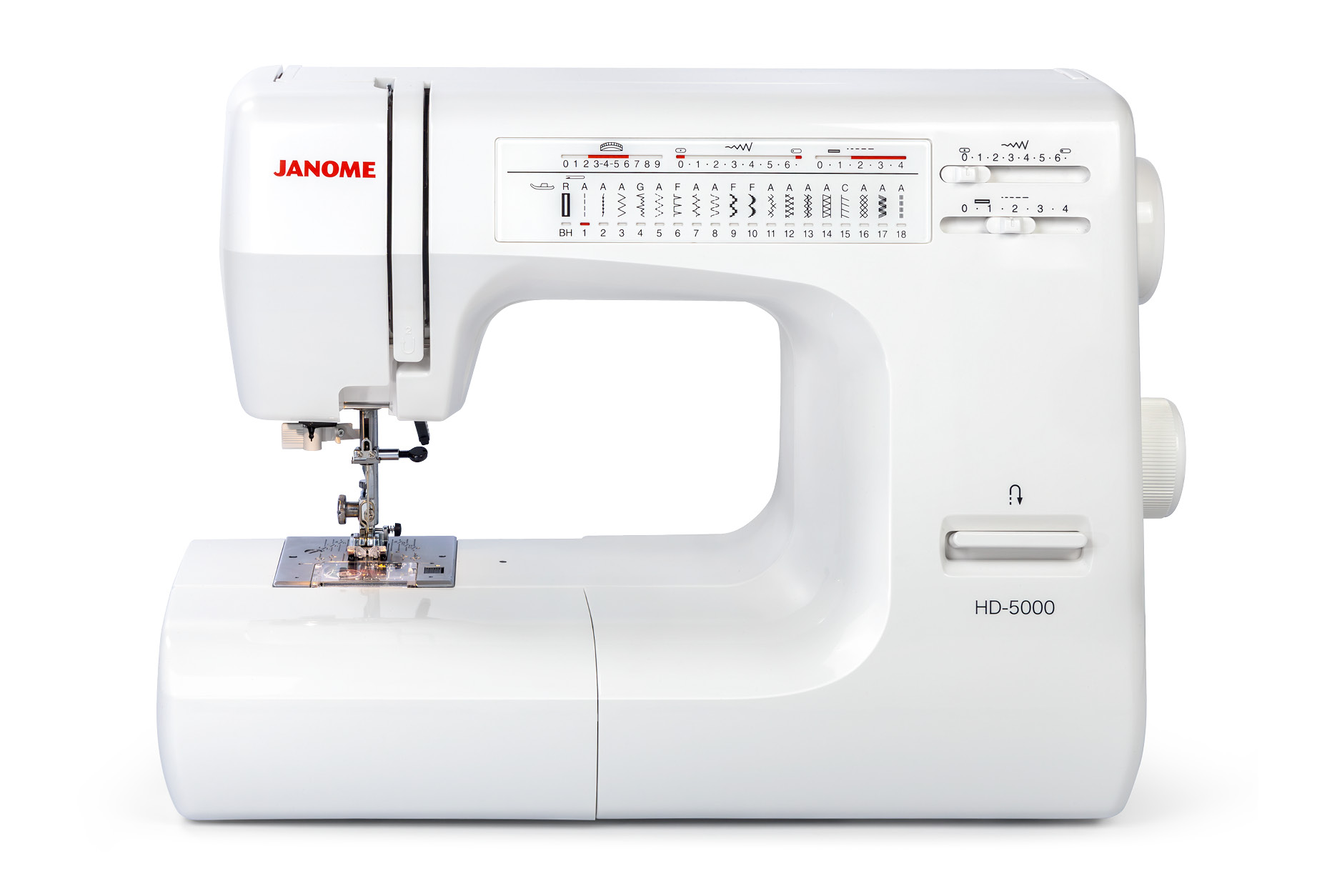 Solid, Reliable and Versatile. The Janome HD-5000 has the features you need for home décor, basic sewing and household repairs. Made with a single-cast aluminum frame, the HD-5000 is a heavy-duty mechanical workhorse that provides durability, smooth and quiet operation through multiple layers of fabric. 18 stitches and a one-step buttonhole provide the foundation for your creative sewing projects and the seven piece feed dog feeds fabric smoothly while maintaining a taut surface. Beautiful stitch results, every time. Thoughtful user conveniences make sewing intuitive and fun: easy access top and free arm storage, one-handed needle threader, snap-on presser feet, tension control, one-touch bobbin cover, flip up chart and quick stitch selection are just the beginning of your creative sewing journey.