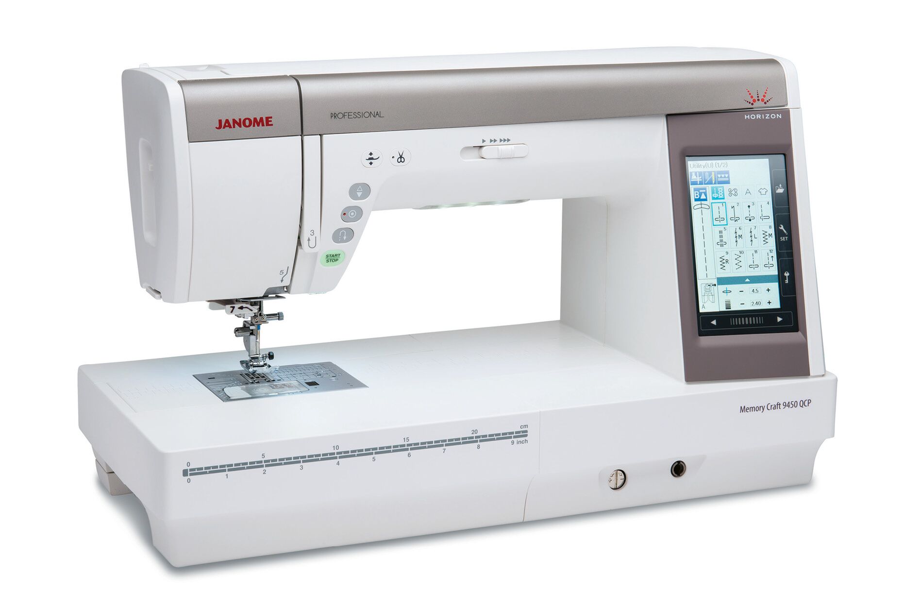 A sewing and quilting machine that is as professional, as you are. The Horizon Memory Craft 9450QCP has the professional initiative features sewists need to simply sit, relax and sew the next, wonder project. Lave a lasting legacy: from rulerwork to patchwork and beyond, the MC9450QCP sets the bench mark for others to follow. The large LCD color touch screen makes it so easy to navigate through the 350 built-in stitches, including 11 one-step buttonholes and 7 alpha numeric fonts including 9mm lettering and numbers. You can customize each stitch, including buttonholes, plus save as a favourite stitch. Sewing Applications gives you a variety of pre-set stitch functions, ready to sew zips, blind hem, buttons, quilting, rulerwork, patchwork and lots more.