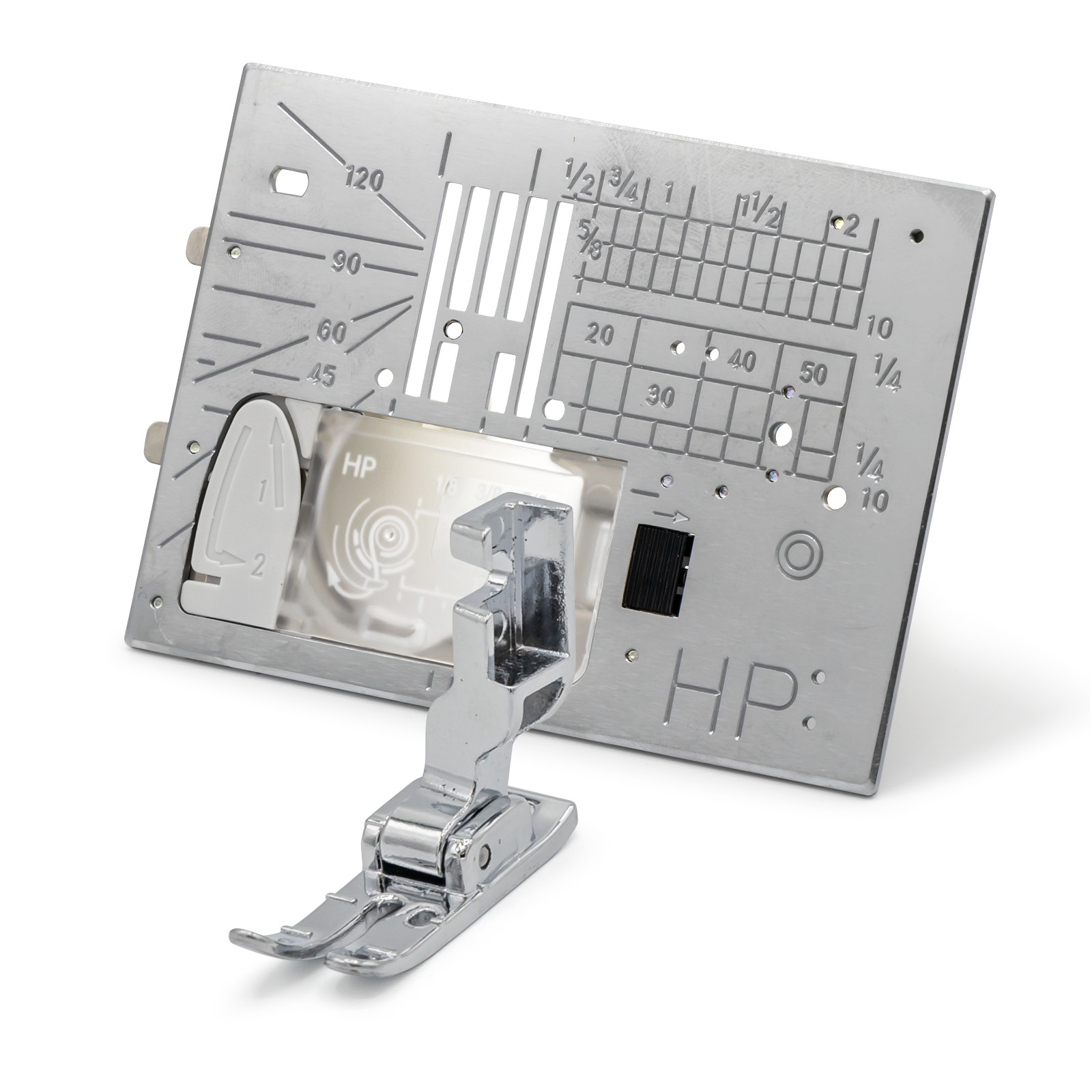 Professional Grade Needle Plate HP and Professional Grade Foot HP – A complete set comprised of a slim and compact presser foot and special matching needle plate. The Foot utilizes the left side feed dogs.