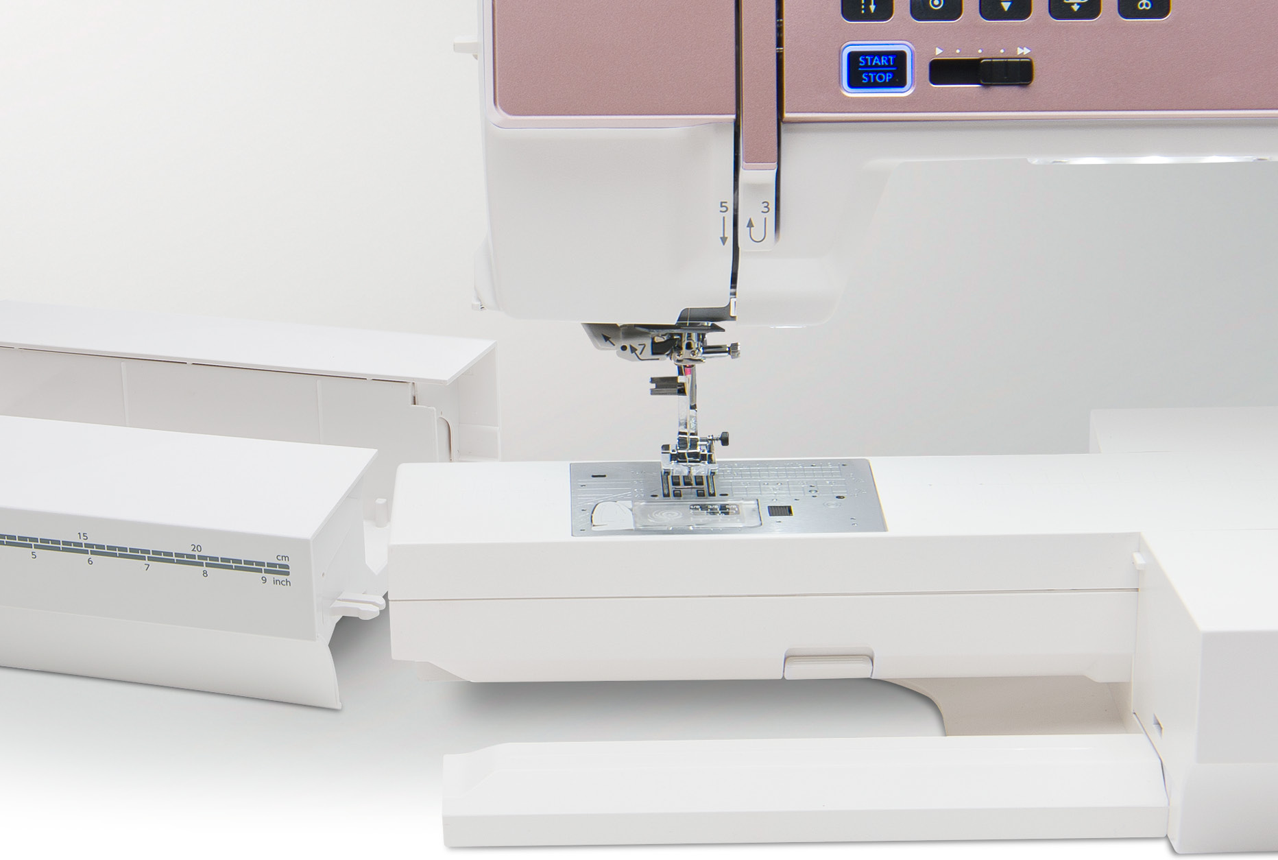 Thoughtful design and ergonomics: the high-def 5″ angled touchscreen, enhanced needle threader and ergonomic function buttons make those quiet “me-time” sewing sessions even more enjoyable. Experience Hi-Definition Sewing with the 300 built-in stitches, 11 one-step buttonholes, 9 mm letters and numbers, Stitch Composer software and more! Achieve precision stitching with the straight stitch needle plate and an enhanced 7-piece feed dog. As your sewing journey progresses, so do your options.
