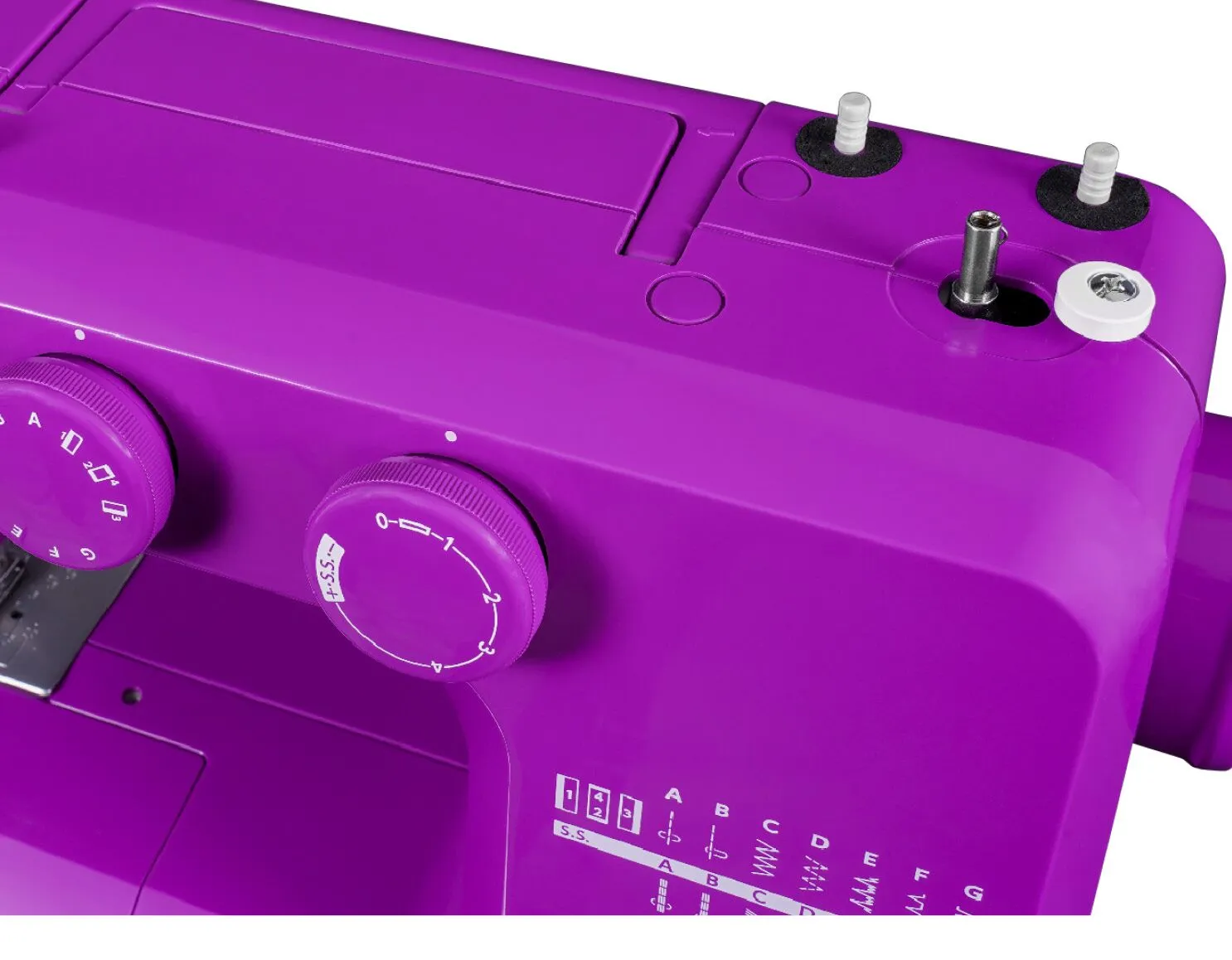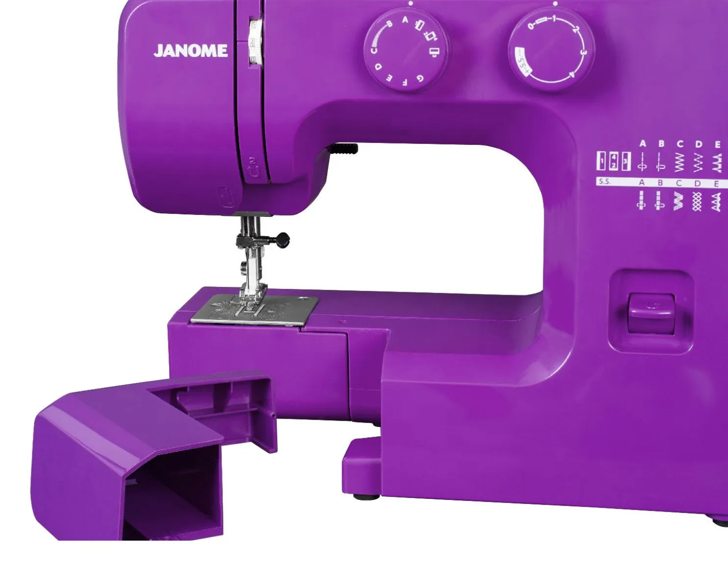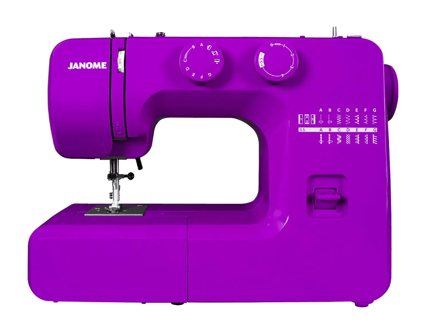 The Janome Purple Majesty sewing machine is a quality entry-level model offered at a fantastic price! This mechanical machine features 15 built-in stitches and a four-step buttonhole. Dial pattern selection and stitch width and length adjustment ensure ease of use. Remove the accessory bin to reveal the great free arm feature making it versatile for all types of sewing. Lightweight and easy to use, this is the perfect machine for a beginner, and the price is just right. Includes: Sliding buttonhole foot, Blind hem foot, Zipper foot, Zig zag foot