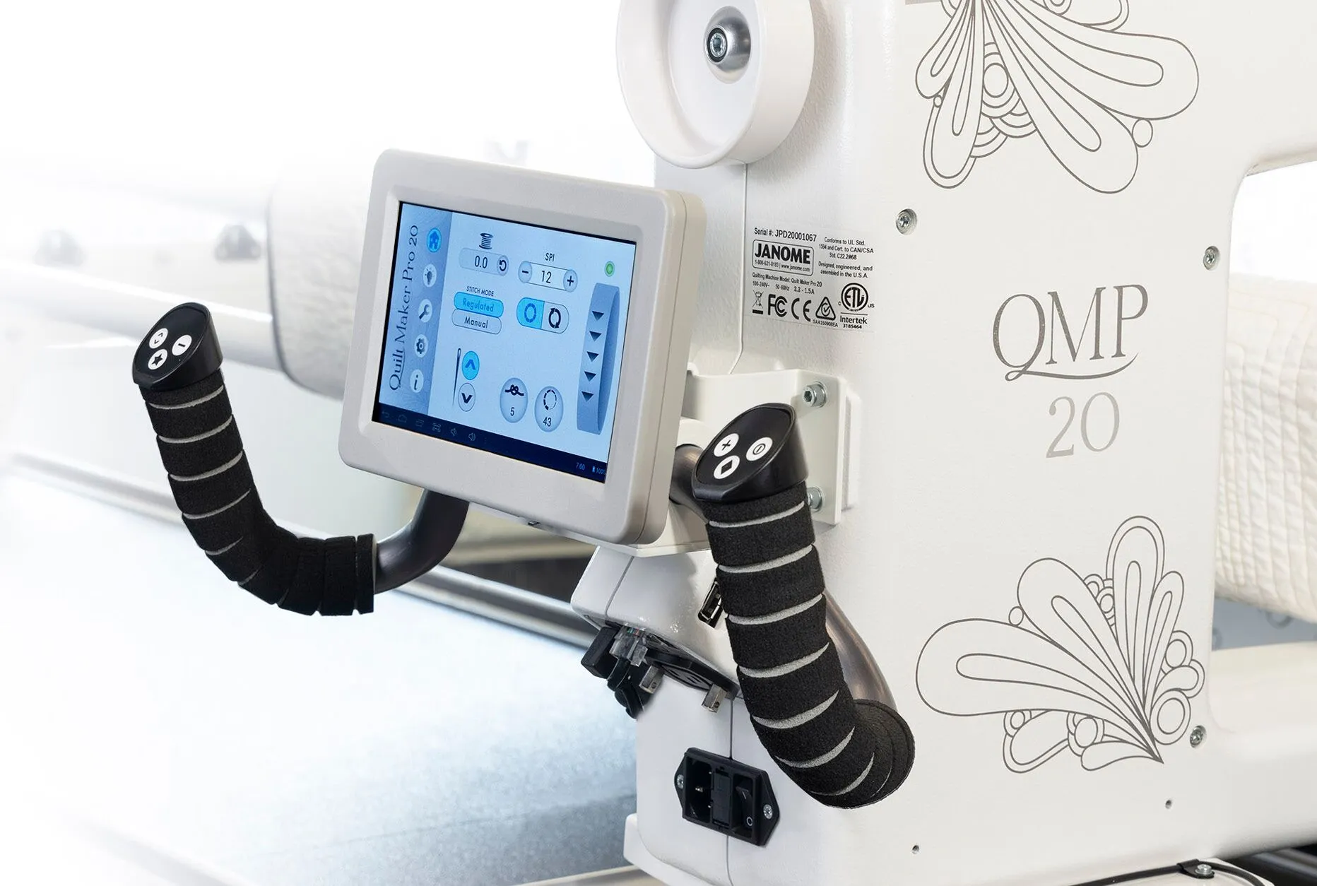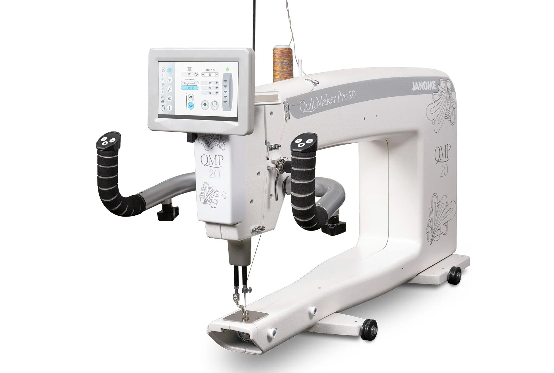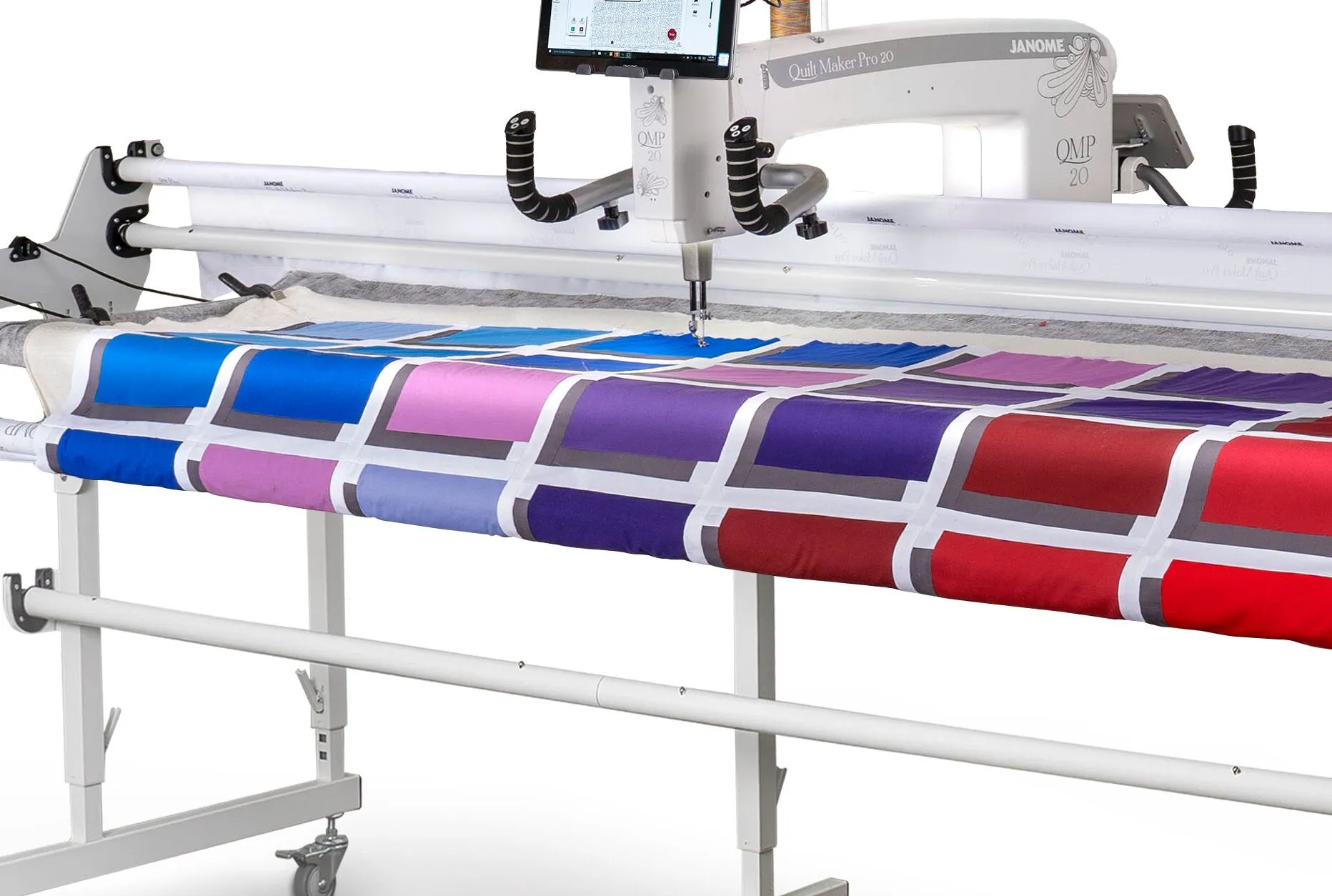 The Quilt Maker Pro is advancing your quilting capabilities. Janome, the leader in innovative products that have changed the sewing industry, offers a long arm format sewing and quilting machine with both precision and cruise stitch regulation. The Quilt Maker Pro 20 offers an adjustable height, customizable handlebar buttons, and speeds of up to 2,500. Includes 12′ frame and bobbin winder.