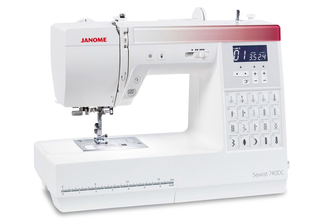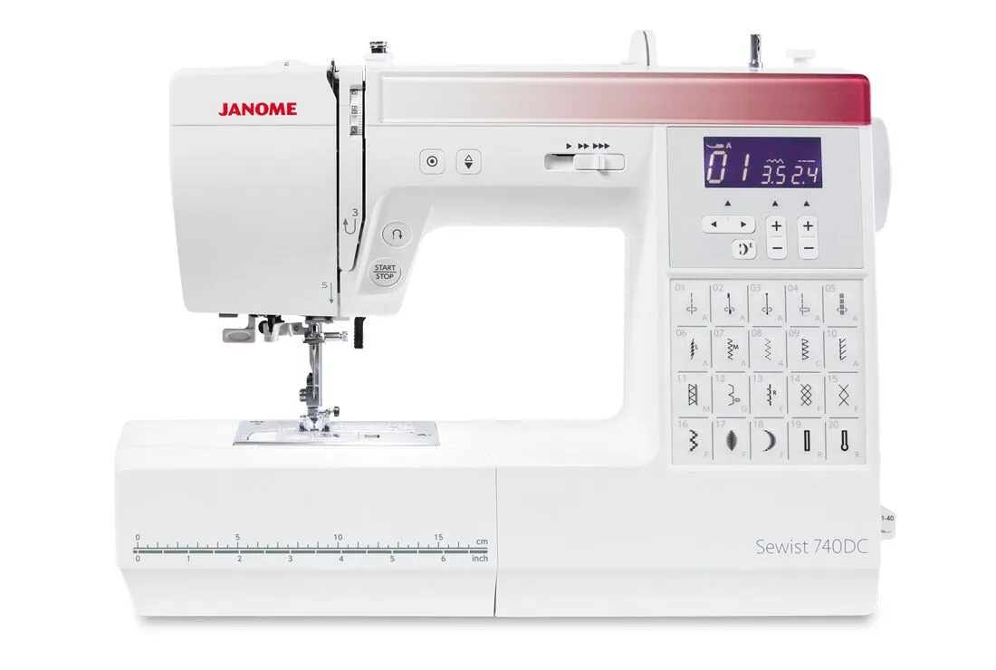 The Janome Sewist 740DC is a really easy to use, fully computerized sewing machine that is packed with so many powerful features. This machine has 40 stitches, for a variety of applications. Direct stitch selection is available for 20 stitches. When a stitch is selected the LCD screen shows, the selected stitch, recommended foot, default stitch width and length, which you can change to suit your requirements. The Sewist 740DC also offers a choice of 3 one-step buttonholes. Special features include pattern elongation of up to 5 times normal length; easy set bobbin system; auto bobbin winder system no need to unthread the machine; built-in needle threader; needle up/down button; and an auto-lock stitch feature for precision locking off of stitches and patterns. The start/stop button allows you to sew without a foot control.