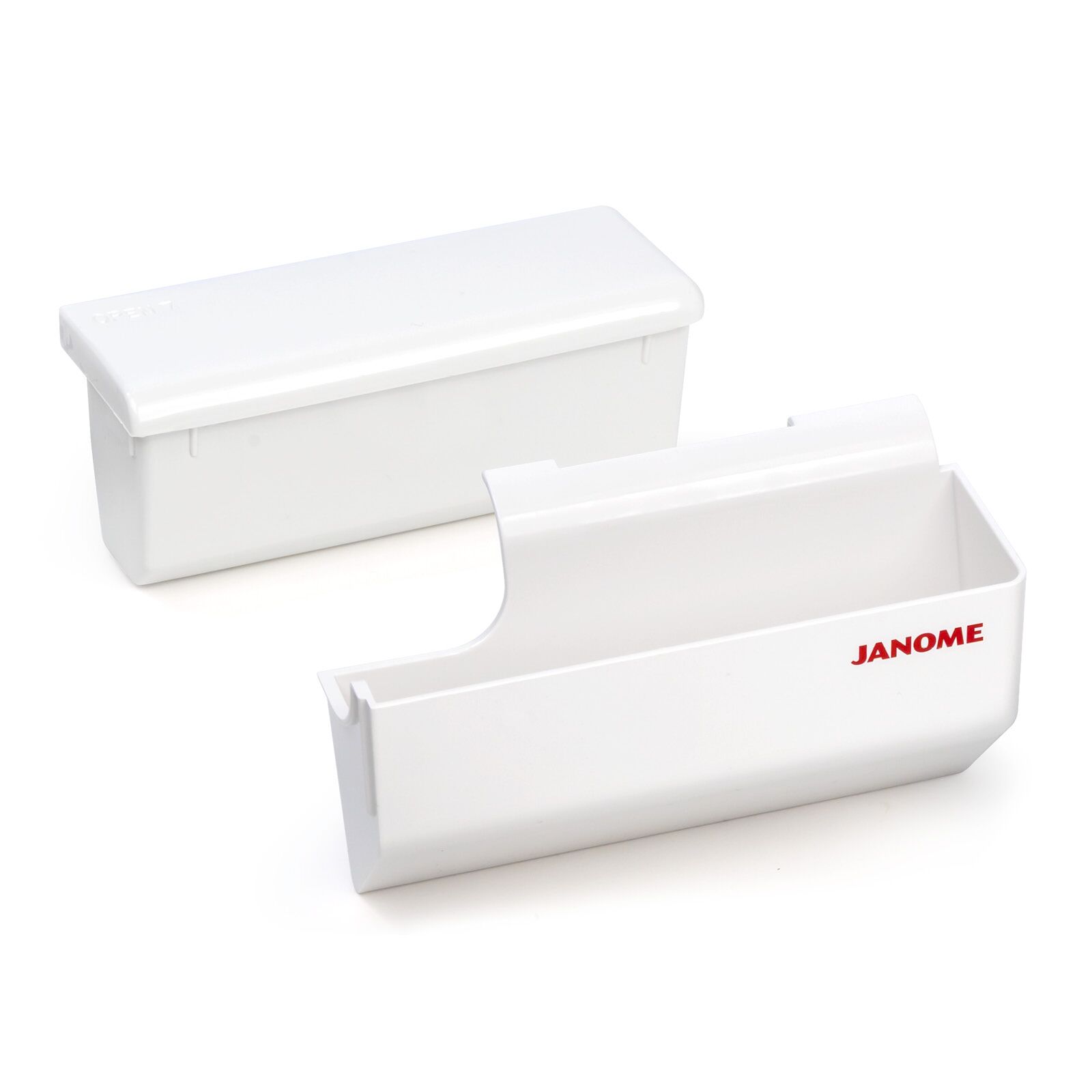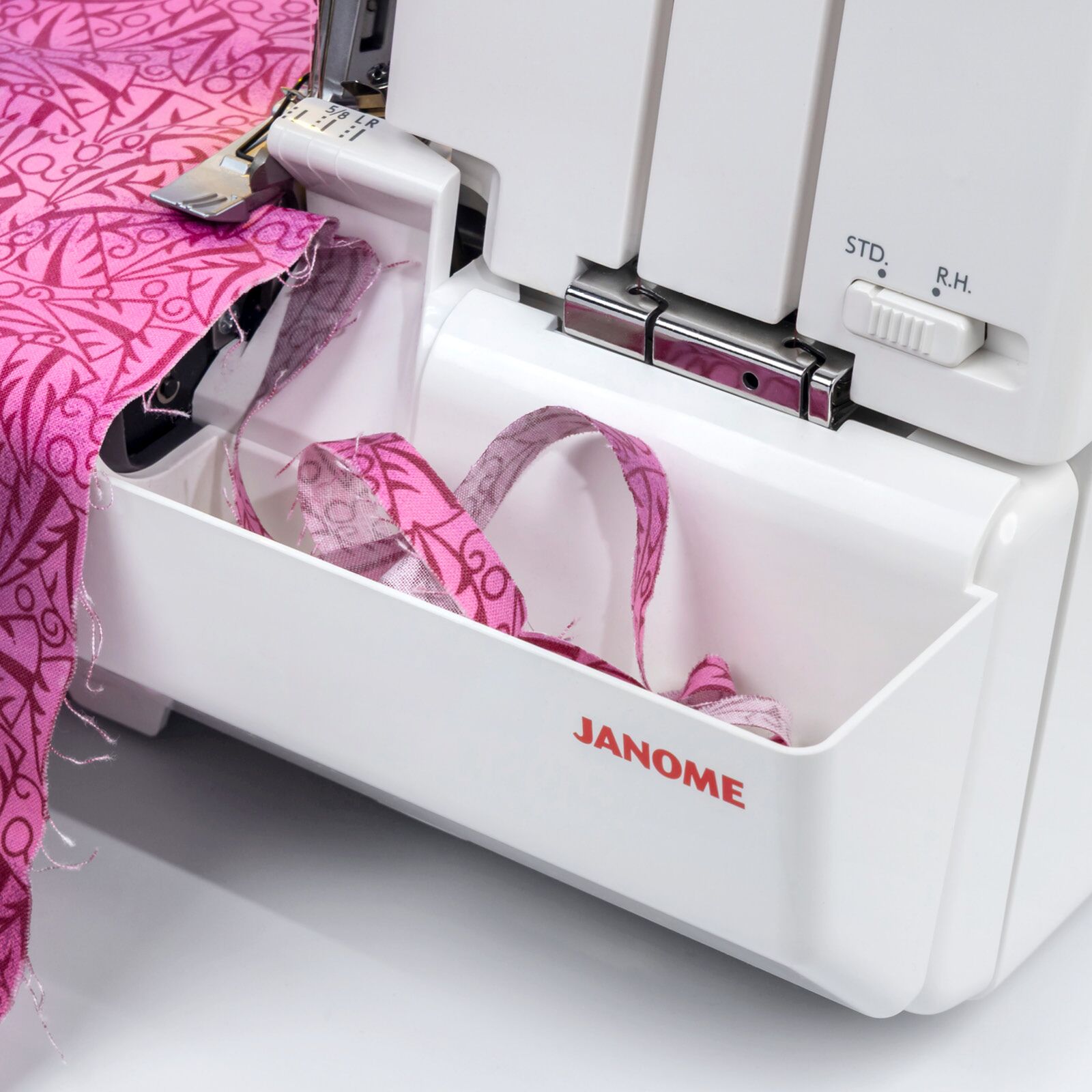 The optional universal waste chip box (202456409) fits most Janome sergers.