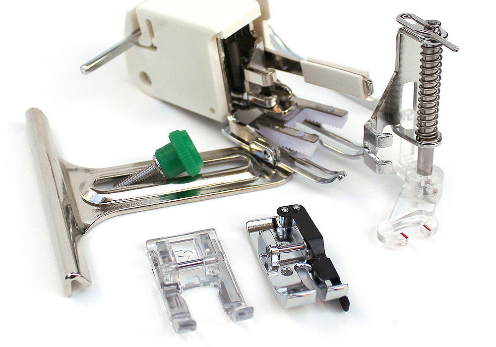 Everything you need for quilting on your QDC-G sewing machine. The set includes the Open Toe Darning Foot, Walking Foot and Cloth Guide.